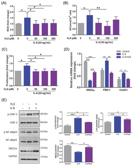 H2S effectively protects against IL-6 induced production of ROS and NO, and phenotypic switch in VSMCs. (A) The intracellular ROS level was detected using the fluorescent probe DCF-DA. (B) Changes in the NO level were measured using a Griess assay. (C) Cell proliferation was examined using a WST-1 assay. (D) RT–qPCR analysis of SM22α, Fibrillin-1 (FBN-1), and Col3A1 mRNA in VSMCs. (E) Western blotting was performed to detect the expression of p-STAT3/STAT3, p-NFkBp65/NF-kBp65, and SM22α. GAPDH was used as a loading control. Each result represents three separate experiments with qualitatively similar results. The data are expressed as mean ± SD. Statistical significance: * p < 0.05, ** p < 0.01, *** p < 0.001.