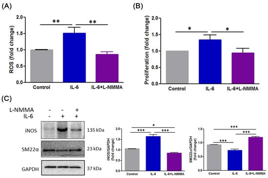 ROS-NO-iNOS axis governs IL-6-induced phenotypic switch in VSMCs. (A) The intracellular ROS level was measured using the fluorescent probe DCF-DA. (B) Cell proliferation was examined using a WST-1 assay. (C) Western blotting was performed to assess the expression of iNOS and SM22α. GAPDH was used as a loading control. Each result represents three separate experiments with qualitatively similar results. The data are expressed as mean ± SD. Statistical significance: * p < 0.05, ** p < 0.01, *** p < 0.001.