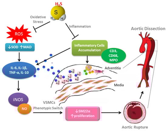 The proposed mechanism of H2S protects against AD formation. Exogenous H2S plays a protective role in vascular remodeling that involves the regulation of oxidative stress, inflammation, NO bioavailability, and cell death. Additionally, the phenotypic switch of VSMCs is a critical characteristic for AD progression and development. H2S inhibits IL-6-induced phenotypic switch of VSMCs through the ROS-NO-iNOS pathway.