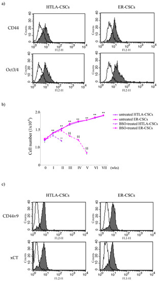 As shown in Figure 1b, BSO markedly counteracted the formation of HTLA-CSCs after two weeks of treatment, while a similar effect was observed in ER-CSCs after five weeks. These results demonstrate that GSH plays a crucial role in the formation and maintenance of CSCs and suggest that its depletion could be employed to increase sensitivity of CSCs to therapeutic approaches.