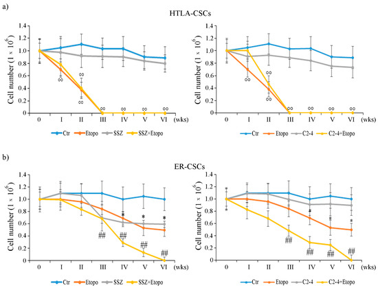 Evaluation of cell number in HTLA-CSCs (a) and ER-CSCs (b) treated three times a week with 0.1 µM C2-4, with 5 µM SSZ or with 1.25 µM Etoposide, administered once a week alone or in combination with C2-4 or SSZ. The treatments were protracted for six weeks. In order to evaluate CSC propagation, at any split, disaggregated CSCs were counted using a Burker chamber as described in Materials and Methods. °° p < 0.01 vs. untreated HTLA-CSCs (Ctr); * p < 0.05 vs. untreated ER-CSCs (Ctr); ## p < 0.01 vs. Etoposide-treated ER-CSCs.