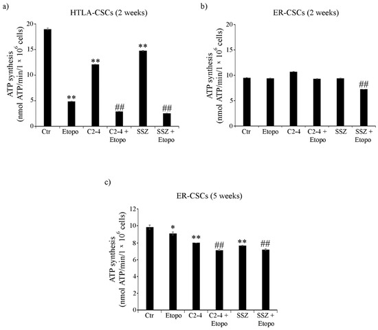 ATP synthesis in both CSC populations treated for two (a,b) or five weeks (c). HTLA-CSCs and ER-CSCs were treated three times a week with 0.1 µM C2-4, with 5 µM SSZ or with 1.25 µM Etoposide, administered once a week alone or in combination with C2-4 or SSZ. Results were reported as nmol ATP/min/106 cells. Bar graph summarizes quantitative data of means ± S.E.M. of three independent experiments. * p < 0.05 vs. untreated CSCs (Ctr); ** p < 0.01 vs. untreated CSCs (Ctr); ## p < 0.01 vs. Etoposide-treated CSCs.