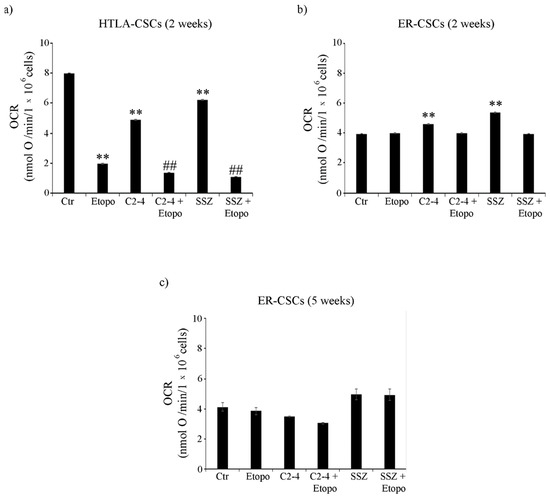 Oxygen consumption rate (OCR) in both CSC populations treated for two (a,b) or five weeks (c). HTLA-CSCs and ER-CSCs were treated three times a week with 0.1 µM C2-4, with 5 µM SSZ or with 1.25 µM Etoposide, administered once a week alone or in combination with C2-4 or SSZ. Results were reported as nmol O/min/106 cells. Bar graph summarizes quantitative data of means ± S.E.M. of three independent experiments. ** p < 0.01 vs. untreated CSCs (Ctr); ## p < 0.01 vs. Etoposide-treated CSCs.
