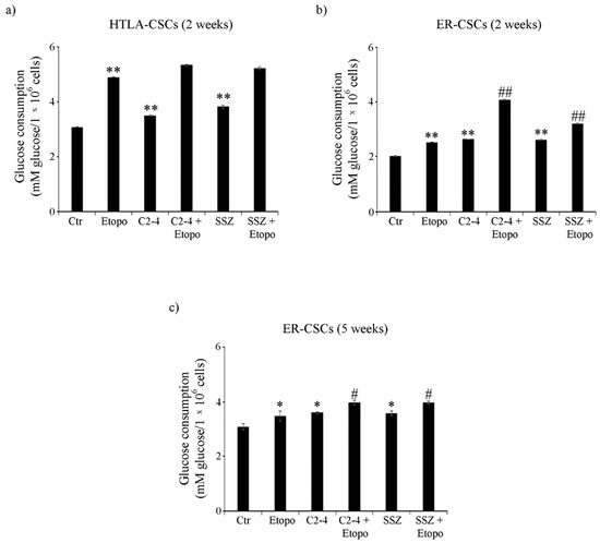 Glucose consumption in both CSC populations treated for two (a,b) or five weeks (c). HTLA-CSCs and ER-CSCs were treated three times a week with 0.1 µM C2-4, with 5 µM SSZ or with 1.25 µM Etoposide, administered once a week alone or in combination with C2-4 or SSZ. Results were reported as mM glucose/106 cells. Bar graph summarizes quantitative data of means ± S.E.M. of three independent experiments. * p < 0.05 vs. untreated CSCs (Ctr); ** p < 0.01 vs. untreated CSCs (Ctr); # p < 0.05 vs. Etoposide-treated CSCs; ## p < 0.01 vs. Etoposide-treated CSCs.