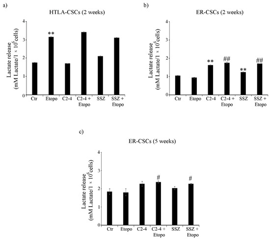 Lactate release in both CSC populations treated for two (a,b) or five weeks (c). HTLA-CSCs and ER-CSCs were treated three times a week with 0.1 µM C2-4, with 5 µM SSZ or with 1.25 µM Etoposide, administered once a week alone or in combination with C2-4 or SSZ. Results were reported as mM lactate/106 cells. Bar graph summarizes quantitative data of means ± S.E.M. of three independent experiments. ** p < 0.01 vs. untreated CSCs (Ctr); # p < 0.05 vs. Etoposide-treated CSCs; ## p < 0.01 vs. Etoposide-treated CSCs.