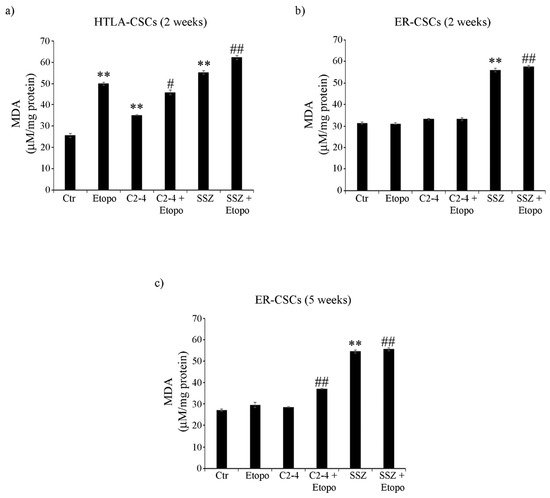 MDA production in both CSC populations treated for two (a,b) or five weeks (c). HTLA-CSCs and ER-CSCs were treated three times a week with 0.1 µM C2-4, with 5 µM SSZ or with 1.25 µM Etoposide, administered once a week alone or in combination with C2-4 or SSZ. Results were reported as μM/mg protein. Bar graph summarizes quantitative data of means ± S.E.M. of three independent experiments. ** p < 0.01 vs. untreated CSCs (Ctr); # p < 0.05 vs. Etoposide-treated CSCs; ## p < 0.01 vs. Etoposide-treated CSCs.