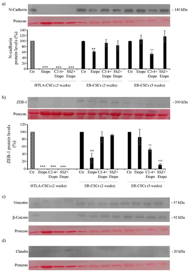 Taken together, the metabolic findings indicate that, although both untreated CSC populations have an efficient OXPHOS metabolism, HTLA-CSCs, following Etoposide exposure, activate glycolysis while ER-CSCs maintain their metabolic adaptation and are able to choose glycolytic metabolism after five-week-co-treatments with C2-4 or SSZ. This data, besides confirming the propensity of CSCs to obtain energy by stimulating OXPHOS [58], also demonstrates that this metabolic rewiring is reversible [59] and that, in having a crucial role in CSC survival, it could be targeted in order to eradicate chemoresistant CSC populations. In agreement with these findings, OXPHOS inhibitors (e.g., metformin) have been found to increase therapy sensitivity of cancer stem cells [60,61].