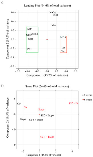 Instead, when looking at the co-treatment with C2-4 it can be seen that a strong effect is also present already at two weeks, but the trajectory followed is quite different. In this case an increase along PC1 together with a decrease along PC2 is observed, corresponding to a decrease of variables N-Cad, OCR and Vim. It can therefore be concluded that C2-4 not only amplifies the effect of Etoposide, but also produces different metabolic variations.