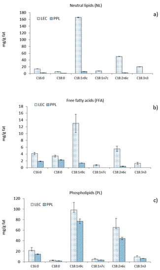 The fatty acid composition of the different lipid fractions is shown in Figure 1. The most abundant fatty acid in LEC was oleic acid, which represents 63% of all fatty acids in NL, 46% in the form of FFA, and 52% in PL. The distribution of linoleic acid among the various fractions in LEC was 19% in NL, 20% in FFA, and 30% in PL. The washing step led to a noticeable removal of both oleic and linoleic acids from NL and also from FFA, inducing a relative increase in the proportion of free saturated fatty acids (C16:0 and C18:0) in PPL. The final concentration of oleic and linoleic acids also decreased in the PL fraction of PPL, although to a lesser extent than in NL and FFA, resulting from the insolubility of phospholipids in acetone.