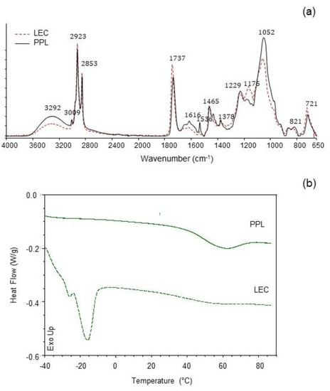 (a) Infrared spectra (ATR-FTIR) and (b) differential scanning calorimetry (DSC) traces of commercial rapeseed lecithin (LEC) and partially purified phospholipid fraction (PPL).