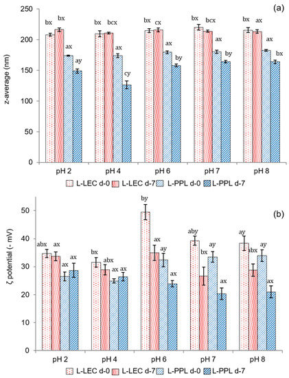 (a) Mean particle size (expressed as z-average, nm) and (b) ζ potential (−mV) of newly prepared (d-0) liposomal suspensions at different pHs and after 7 days of chilled storage (d-7). L-LEC: liposomes made of rapeseed lecithin loaded with chia extract; L-PPL: liposomes made of partially purified phospholipid fraction loaded with chia extract. Different letters (a,b,c) indicate significant differences (p < 0.05) as a function of pH. Different letters (x;y) indicate sig-nificant differences (p < 0.05) as a function of storage day.