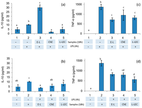 IL-10 and TNF-α secretion in THP-1 cells differentiated into macrophages tested by ELISA kit. (a,c) Cells were treated with samples E-L (500 μg/mL), chia extract (160 μg/mL), and L-LEC (660 μg/mL) for 18 h and then stimulated with LPS (1 μg/mL) for 4 h. (b,d) Cells were stimulated first with LPS and then treated with the samples. 1: control cells, 2: control cells treated with LPS, 3 E-L, 4: ChE, and 5: L-LEC. E-L: empty liposomes; ChE: chia extract; and L-LEC: liposomes made of rapeseed lecithin loaded with chia extract. Different letters (a,b,c) indicate significant differences (p < 0.05) among samples.