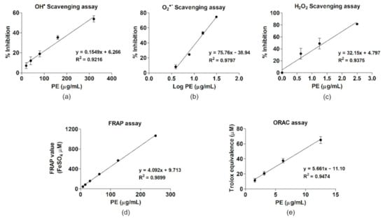 The linear regression of specific reactive oxygen species (ROS)-scavenging activities and antioxidant capacities of PE. (a) OH•, (b) O2•−, and (c) H2O2 scavenging activities. Antioxidant activities according to (d) FRAP and (e) ORAC.