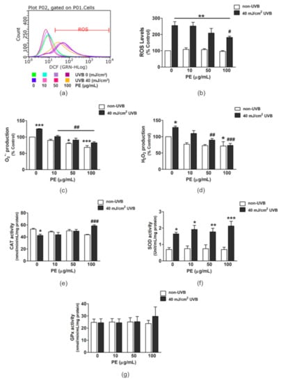 The effect of PE on UVB-induced intracellular ROS production and enzymatic antioxidant activity in HaCaT cells. (a) A fluorescent intensity diagram of DCFH-DA signals as detected by flow cytometry. (b) The calculated relative intracellular ROS levels in each sample group compared with those in the non-UVB group. (c) The intracellular superoxide (O2•−) production in HaCaT cells after PE preincubation and UVB exposure. (d) The intracellular H2O2 production in HaCaT cells following the PE incubation and UVB irradiation. (e) CAT activity; (f) SOD activity; (g) GPx activity. The data are shown as the mean ± SEM. *, p < 0.05; **, p < 0.01; and ***, p < 0.001, when compared to the non-UVB group; #, p < 0.05; ##, p < 0.01; and ###, p < 0.001, when compared to the UVB-exposed group.