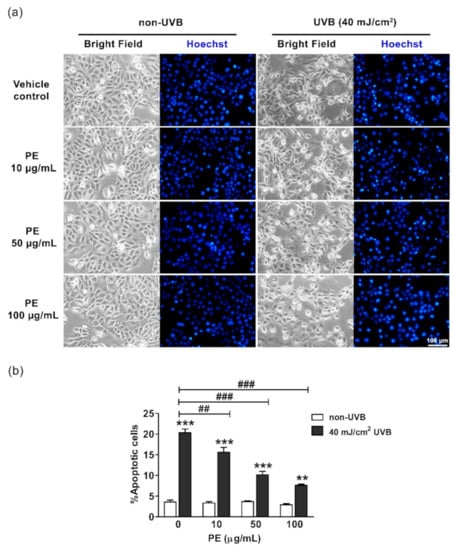 The effects of PE on UVB-induced apoptosis in HaCaT cells. (a) The morphological changes of HaCaT cells as observed under inverted light (bright field) and fluorescent microscopy (Hoechst staining). (b) The calculated percentages of apoptotic cells after PE and UVB irradiation. The data are shown as the mean ± SEM. **, p < 0.01, and ***, p < 0.001, when compared to the non-UVB group; ##, p < 0.01, and ###, p < 0.001, when compared to the UVB-exposed group. Scale bar, 100 µm.