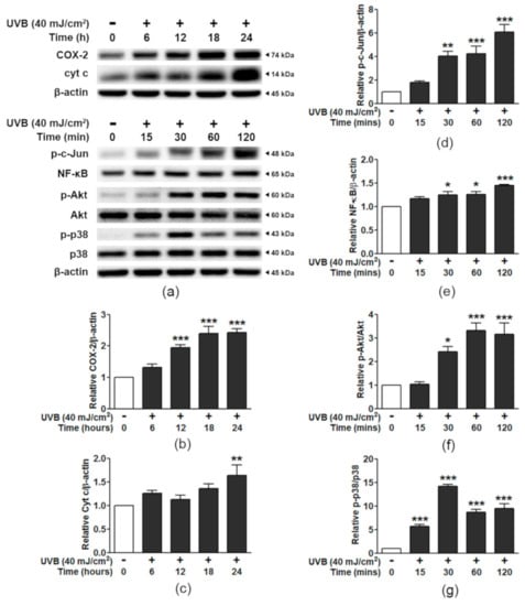 A time-course study of apoptotic and inflammatory signaling changes in HaCaT cells exposed to UVB. (a) Western blot bands for COX-2 expression and cyt c levels detected at 0, 6, 12, 18, and 24 h and p-c-Jun, NF-κB, Akt, and p38 detected at 0 to 120 min after UVB irradiation. (b) Graphical presentation of the calculated ratios of COX-2/β-actin and (c) cyt c/β-actin. (d) p-c-Jun/β-actin, (e) NF-κB/β-actin, (f) p-Akt/Akt, and (g) p-p38/p38. The data are shown as the mean ± SEM (n = 3). *, p < 0.05; **, p < 0.01; ***, p < 0.001, when compared to the non-UVB group.