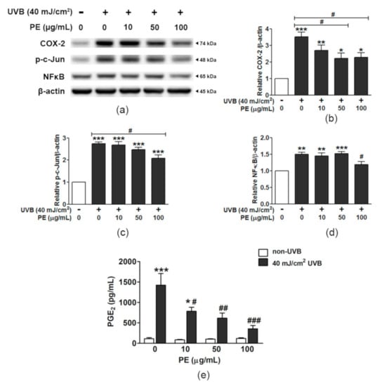 The effects of PE and UVB on the activation of COX-2, p-c-Jun, NF-κB, and Nrf2. (a) The protein bands of COX-2 and cyt c in relation to β-actin. The relative ratios of the band intensity for (b) COX-2/β-actin, (c) p-c-Jun/β-actin, and (d) NF-κB/β-actin; (e) the levels of prostaglandin E2 (PGE2). The data are shown as the mean ± SEM (n = 3). *, p < 0.05; **, p < 0.01; and ***, p < 0.001, when compared to the non-UVB group; #, p < 0.05; ##, p < 0.01; and ###, p < 0.001, when compared to the UVB-exposed group.