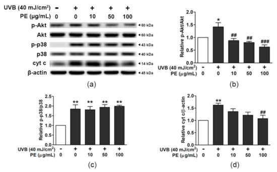 The effects of PE on the UVB-induced activation of p-Akt, p-p38, and cyt c in HaCaT cells. (a) The protein bands for p-Akt, Akt, p-p38, p38, cyt c, and β-actin. The relative ratios of (b) p-Akt/Akt, (c) p-p38/p38, and (d) cyt c/β-actin. The data are shown as the mean ± SEM (n = 3). *, p < 0.05, and ** p < 0.01, when compared to the non-UVB group; ##, p < 0.01, and ###, p < 0.001, when compared to the UVB-exposed group.