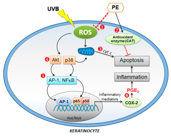 Schematic diagram depicting the proposed mechanisms of PE cytoprotection against UVB-induced HaCaT cell inflammation and apoptosis. ❶ The antioxidant effects of PE predominantly reduced ROS generation, particularly hydrogen peroxide generation, and ❷ the endogenous antioxidant defense enzyme CAT was activated. ❸ PE inhibited cyt c release. While PE had no impact on p38-induced apoptosis, it inhibited the dysregulation of PI3K/Akt ❹, which partakes in the balance of signaling pathways toward cell survival or apoptosis. PE attenuated the inflammatory response to UVB irradiation via the inhibition of the inflammatory signaling of ❺ AP-1, NF-κB, and the mediator ❻ PGE2.