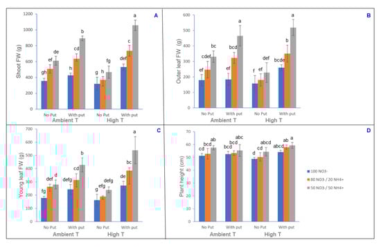Effect of heat stress, different NO3−/NH4+ ratios and the foliar application of 2.5 mM putrescine on shoot FW (A), outer leaf FW (B), young leaf FW (C), and plant height (D) of cauliflower. For data analysis, an ANOVA was performed and the pairwise changes were defined using the Tukey post hoc test. Thus, different letters represent significantly different mean values according to the Tukey test at p ≤ 0.05.