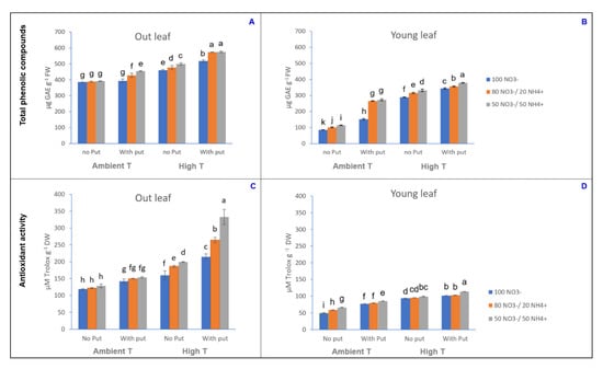 The phenolic compounds and antioxidant activity in cauliflower leaves were increased as a result of the exogenous application of putrescine, as well. This is in agreement with Chen and collaborators [38], who indicated that polyamines promote not only photosynthetic activity, but also the antioxidant capacity and osmotic adjustment ability of plants. In particular, in work carried out in wheat, foliar treatment with putrescine (2.5 mM) alleviated the adverse effect of high temperature, increasing the thermotolerance [45]. As can be seen in Figure 2, in the present study, the distribution of phenolic compounds varied as a consequence of the application of thermal and nutritional stresses, and the content of phenolic compounds also varied with the age of the leaves. In this sense, our data show that the young leaves from stressed plants had a greater accumulation of TPC than the outer leaves. This finding is in accordance with several studies performed in many higher plant species during the last two decades, which stated that young tissues generally have higher accumulation of secondary metabolites overall in plants that suffer any abiotic stress [44].