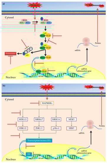 Another interesting pathway involved in inflammatory response is the so-called “mitogen-activated protein kinases (MAPKs) cascade” [,,] (Figure 3b). MAPKs are proteins belonging to Ser/Thr kinases, which regulate various cellular processes via modulation of gene expression in response to specific stimuli []. In mammals, four groups of MAPKs have been identified: extracellular signal-related kinases (ERK)-1/2, c-Jun amino-terminal kinases (JNK)-1/2/3, p38-MAPK(α-δ) and ERK5. Each one is activated via phosphorylation by specific MAP kinase kinases (MAPKKs) (MEK1/2, MKK4/7, MKK3/6 and MEK5, respectively). Each MAPKK is, in turn, phosphorylated and activated by MAP kinase kinase kinases (MAPKKKs) []. It has been reported that polyphenols play a role in modulation of the MAPK pathway, acting at different levels []. In particular, polyphenols such as kaempferol, chrysin, apigenin, luteolin, quercetin, catechin, cyanidin-3-O-glucoside, EGCG have shown to exert inhibitory activities on different MAPKs of the MAPK cascade, resulting in reduced transcription of inflammatory cytokines [,].