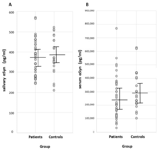 Figure 1. Individual total αSyn concentration (pg/mL) in (A) saliva and (B) serum in patients with IPD and control participants, as measured with ELISA. Mean and standard deviation are represented with solid lines. Abbrev.: αSyn, α-synuclein; IPD, idiopathic Parkinson’s disease; ELISA, enzyme-linked immunosorbent assay.