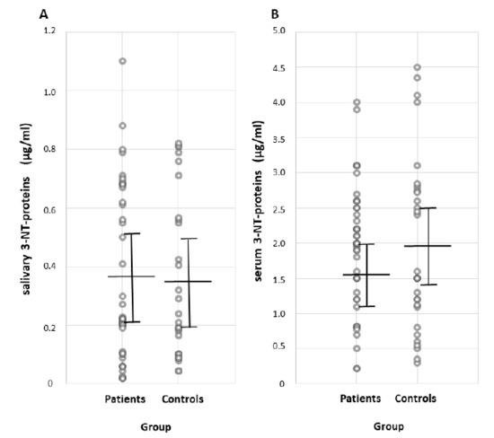 Figure 2. Individual 3-NT-proteins concentration (µg/mL) in (A) saliva and (B) serum in patients with IPD and control participants, as measured with ELISA. Mean and standard deviation are represented with solid lines. Abbrev.: 3-NT-proteins, 3-nitrotyrosine proteins; IPD, idiopathic Parkinson’s disease; ELISA, enzyme-linked immunosorbent assay.