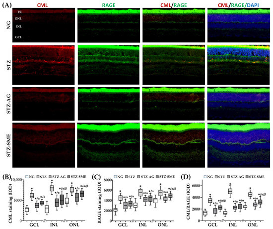 Figure 1B shows that SME decreased the CML immunostaining in all three retinal layers compared to STZ (p < 0.01). The treatment with AG (STZ-AG) presented a more significant decrease than STZ-SME in CML staining in both INL and ONL (p < 0.05). In GCL, there was no difference. In NG, CML staining was lower in the three retinal layers than all those treated with STZ (p ≤ 0.05). Figure 1C,D show that stainings for RAGE and CML/RAGE were higher in STZ than STZ-SME, STZ-AG, and NG (p < 0.001).