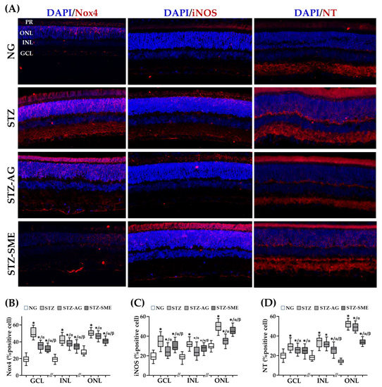 Antioxidant effect of SME in the retina of STZ. (A) Representative micrographs of immunofluorescence for NADPH oxidase 4 (Nox-4) (A), inducible nitric oxide synthase (iNOS), and nitrotyrosine (NT). (B–D) show the box-and-whisker plots of the percentage positive cells in GCL, INL, and ONL for each immunostaining in NG, STZ, STZ-AG, and STZ-SME groups. The nuclei were stained with DAPI (blue). * p < 0.01 compared to NG; α p < 0.05 compared to STZ; and β p < 0.01 compared to STZ-AG. Magnification 200×. In supplement 3, DAPI and each specific antibody stain are shown in a single-channel and the fused images.