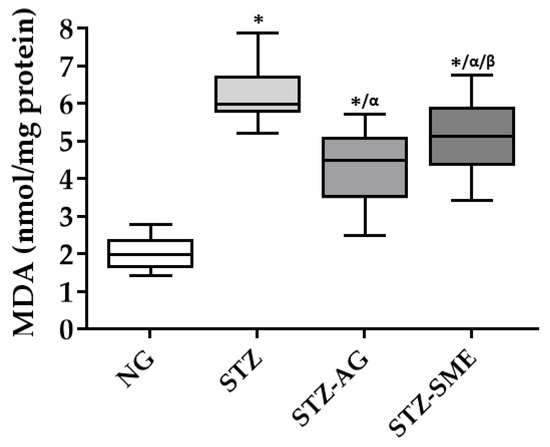 Antioxidant effect of SME in the diabetic retina determined by lipid peroxidation. Malondialdehyde (MDA) levels in the NG, STZ, STZ-AG, and STZ-SME groups were analyzed. Concentrations are shown in the box-and-whisker plot. * p < 0.01 compared to NG; α p < 0.01 compared to STZ; and β p < 0.05 compared to STZ-AG.