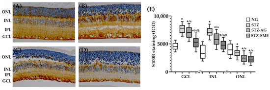 The S100 calcium-binding protein B (S100B) levels in the retina of the STZ. Retina sections were stained with anti-S100B in the NG (A), STZ (B), STZ-AG (C), and STZ-SME (D) groups. (E) Shows the box-and-whisker plot of the IOD for S100B protein staining in the three retinal layers for all groups. * p < 0.01 compared to NG; α p < 0.01 compared to STZ; and β p < 0.01 compared to STZ-AG. Magnification 200×.