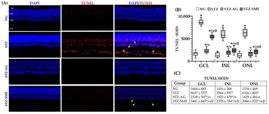 Effect of SME on the retinal degeneration of STZ. Apoptosis was determined by terminal deoxynucleotidyl transferase (TdT)-mediated deoxyuridine triphosphate (dUTP) nick-end labeling (TUNEL) assay in the NG, STZ, STZ-AG, and STZ-SME groups (A). Yellow arrows indicate representative cell apoptosis (A). The nuclei were stained with DAPI (blue). (B) The box-and-whisker plot of the IOD for the TUNEL staining in GCL, INL, and ONL. (C) Data shown in mean ± SD. * p < 0.01 compared to NG; α p < 0.01 compared to STZ; and β p < 0.01 compared to STZ-AG. Magnification 200×.