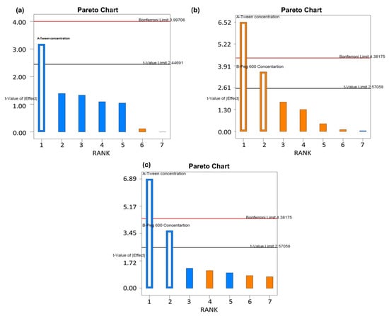 Pareto charts for response variable (a) particle size, (b) % entrapment efficiency, and (c) PDI.
