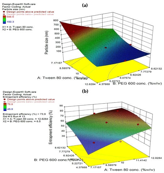 Response surface curves for (a) particle size, and (b) entrapment efficiency.