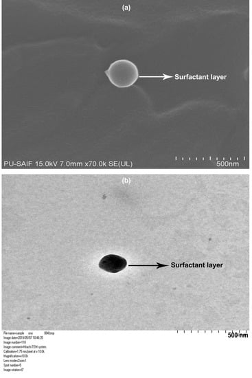 An average particle size of 170.1 ± 26.6 nm and a significantly low PDI of 0.143 ± 0.026 was observed (n = 10; Figure S1a in Supplementary Data). A low PDI indicates a uniform distribution of particles around the mean. The zeta potential was found to be −9.67 ± 1.47 (n = 6) (Figure S1b in Supplementary Data). Although a zeta potential of >±25 is considered a measure of good stability; however, the present SLN dispersion was also observed to be stable. It is often contested that zeta potential is measured after dilution of the original dispersion and thus does not give a true measure of the charge on the particles. Further, as per the DLVO theory, the colloidal stability is a sum of the van der Waals attractive and electrostatic repulsive forces due to the electron double layer []. While zeta potential is a measure of the electrostatic repulsive forces, it does not consider the attractive van der Waals forces []. Considering that PEG forms hydrogen bonds with water molecules, we expect some stability being assigned because of that too. Further, a surfactant layer, as observed presently and shown below in the FESEM and TEM studies (Figure 3a,b) around the solid lipid nanoparticle, also attributes to its stability to aggregation.