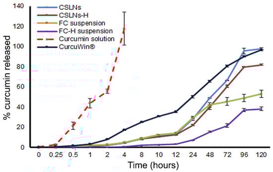 Jacketed Franz diffusion cells were used to assess the in vitro release of free curcumin and curcumin from the CSLNs. These cells consist of the donor and the receptor chamber between which the dialysis membrane is positioned. The dialysis membrane was soaked in double-distilled water for 12 h before use. The whole system was water-jacketed and thermostatically controlled by an external circulating water bath at 37 ± 1 °C. The receptor media consisted of 50% methanol in distilled water. Initially, a pH 6.8 buffer was used as the receptor medium, but it resulted in simultaneous degradation of curcumin so that estimations could not be made correctly. The CSLN and the corresponding concentration of free curcumin (0.5 mL each) dispersed in 1.0% (w/v) CMC was poured evenly on the donor side covered with a paraffin film to avoid evaporation of the loaded sample. The receptor media were stirred throughout the experiment, using a magnetic stirrer. The entire cell was covered with aluminum foil to prevent photodegradation of the curcumin. Aliquots (1 mL) were withdrawn regularly from the receptor compartment at various times, starting at 30 min, and replaced by an equal volume of fresh receptor medium. The samples were analyzed immediately, spectrophotometrically, at 425 nm after a suitable dilution when required. The safety studies are included in the Supplementary Data (S1.2.5).