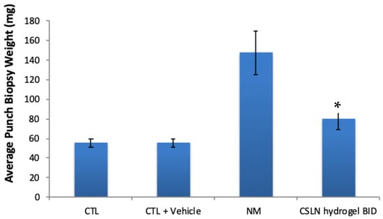The mice divided into four groups (6 animals/group), a nitrogen mustard (NM) control (only nitrogen mustard), CSLN hydrogel (NM followed by CSLN treatment twice a day containing 50.6 μg curcumin per application), a naïve control (no NM, no drug, no vehicle) and a vehicle control (Pluronic F127-based thermo-sensitive gel with d-α-tocopheryl polyethylene glycol 1000 succinate treatment; no NM), were anesthetized via isoflurane under the fume hood. Acetone (10 μL) was used to adhere 6 mm glass microfiber filter discs (GE Healthcare, Buckinghamshire, UK) on either side of the shaved skin of the lumbar region of the mice, at equal distance from the spine. The freshly prepared 1M NM HCl (20 μL; 20 μmol) in 20% deionized water/80% acetone v/v was then applied to the filters, which were then immediately covered with PARAFILM® (Pechiney, Menasha, WI, USA). The PARAFILM® and filter discs were removed after 6 min and the mice kept in the fume hood, housed 2 per filter top cage with a removable divider separating them, were then allowed to recover from anesthesia. The CSLN/vehicle hydrogel was gently rubbed into the skin of the wounded areas, three hours post NM application. The treatments were repeated on days 2 and 3. The mice were relocated from the fume hood to the vivarium on the 2nd day. On the fourth day, 12 mm, full-thickness punch biopsies of the exposure site and surrounding tissue were collected using a biopsy punch. The biopsies were weighed (mg) with an analytical balance to assess the degree of skin inflammation relative to the control groups [].