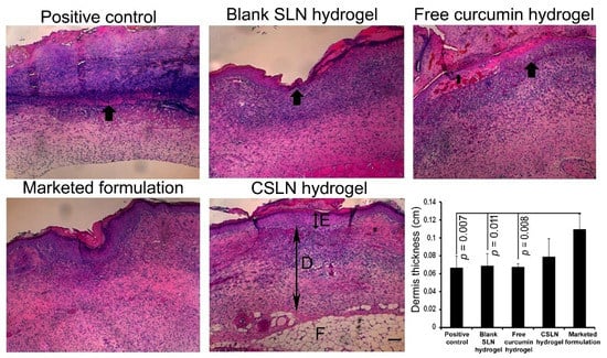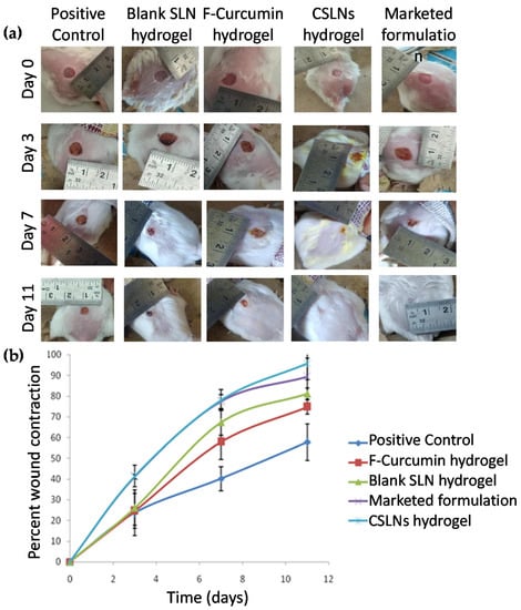 Lacca mice were used for the study and were divided into six groups (n = 8). The animals were depilated on the paravertebral area before wound creation and a circular excision wound of 6 mm in diameter was created using a biopsy punch. The animals were treated with a free curcumin Carbopol 934P hydrogel (200 mg containing 1 mg of curcumin), a blank SLN Carbopol 934P gel, marketed formulation (Soframycin®) and a CSLN Carbopol 934P gel (200 mg of hydrogel containing 1 mg of curcumin) once daily for 11 days. Two control groups (naïve control and positive control (full excision wound but no treatment)) were also included in the study. The animals with undressed wounds were housed individually. The progressive reduction in the wound area of the animals, expressed as mm2, was monitored planimetrically by tracing the wound margin on a graph paper every alternate day for 11 days.