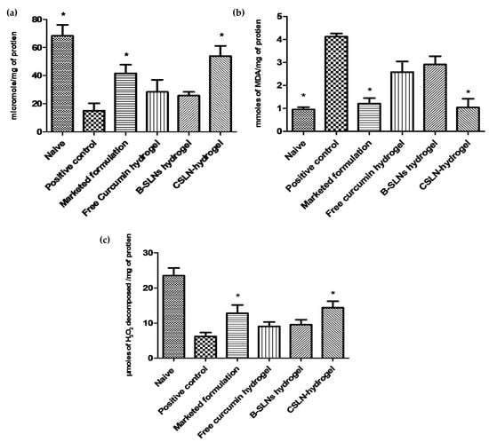 2.6.3. Effect of Topical Application of CSLNs on Lipid Peroxidation, Reduced Glutathione and Antioxidant Enzyme Catalase