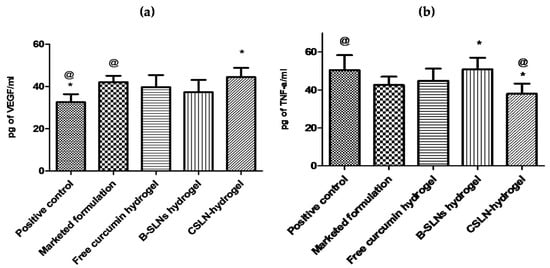 However, CSLNs area thin aqueous dispersion which is not suitable for topical application. Furthermore, it has been implicated that wound dehydration disturbs the ideal environment to stimulate the wound healing process; therefore, the maintenance of a moist wound bed is another important consideration for effective wound healing. Hence, CSLNs were incorporated within a three-dimensional polymeric network of a hydrogel. The hydrogel would absorb the tissue exudates, prevent wound dehydration, and allow oxygen to permeate [].Moreover, the mechanical properties of hydrogels in terms of porosity (allowing the absorption of large volumes of wound exudate), flexibility (adaptation to wound geometry), viscosity, shear stress (deformability adapted to the skin), and elasticity also aid in expediting the healing process, thus establishing a synergism between the CSLNs and their hydrogel cargo.