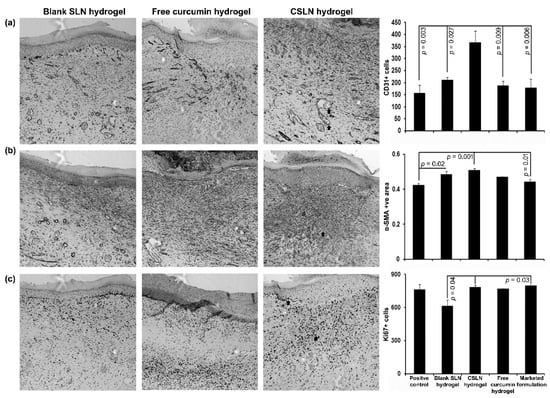 At the end of the study the mice were sacrificed, and the skin tissue was excised including the wound scar area, and then processed for histological studies as previously described [,]. Briefly, tissues were fixed initially in 10% formalin (48–72 h shaking) and then stored in 70% ethanol at 4 °C until processed. The tissues were then paraffin-embedded and 5 µm-thin sections were cut from the middle of the wound and stained with hematoxylin and eosin (H&E) to visualize the tissue morphology and measure the thickness of the epidermis and dermis using ImageJ (NIH). For immunohistochemistry, the tissues were de-paraffinized and rehydrated, followed by antigen retrieval (2100 Antigen Retriever). Sections were then rinsed in PBS, endogenous H2O2 blocking (3% in PBS, 20 min), nonspecific blocking with a serum-free protein (20 min at RT; Dako, Denmark), and endogenous biotin-blocking using an avidin/biotin reagents kit (Vector Laboratories, Burlingame, CA, USA), including washing sections (5 min × 2) at each step by Tris-buffered saline with Tween-20 (TBST). Then, the sections were stained overnight with the primary antibodies, namely, anti-alpha-smooth muscle actin (a-SMA; rabbit monoclonal IgG, 1:2000; Epitomics, Inc., Burlingame, CA, USA), CD31 (rabbit polyclonal IgG, 1:200; Abcam, Cambridge, MA, USA), and Ki67 proliferation antigen (rabbit monoclonal IgG, 1:1000; Lab Vision Corporation, Fremont, CA, USA) followed by a secondary antibody (biotinylated goat anti-rabbit, 1:200; Vector Laboratories). The sections were then washed (TBST, 5 min, twice), stained with working ABC reagent (Vectastain ABC Kit, 30 min at RT; Vector Laboratories), NovaRed solution (5 min at RT), and counterstained with Mayer’s hematoxylin and Scott’s bluing reagents, with intermediate washes with dH2O. The sections were then dehydrated and mounted using Cytoseal 60. The sections were also stained with normal rabbit Ig fraction (1:400,000; Dako, Santa Clara, CA, USA) overnight at 4 °C as a negative control. The positive cells/area (sum of dermis and epidermis) for CD31, Ki67, and a-SMA, in the stained sections, were determined by ImageJ (NIH, Bethesda, MD, USA). Two sections were averaged for each animal (n = 2).