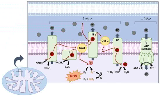 Normally, for the great majority of molecular oxygen (O2) processed in the mitochondria, the conversion to water involves the four-electron reduction of O2 by hydrogen. This is a finely coordinated process, in which the electrons from the electron donors NADH and FADH2 are transferred through Complexes I–IV of the electron chain and protons are extruded outwards into the intermembrane space, generating a proton gradient (Figure 1).
