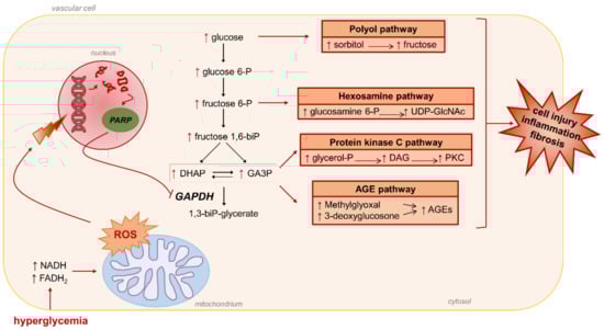 Regarding the mechanism linking superoxide overproduction to the activation of the four pathways mentioned above, it was proposed that hyperglycemia-induced ROS generated in mitochondria activates the nuclear DNA-repair enzyme poly(ADP-ribose) polymerase (PARP) by inducing DNA strand breaks. Once activated, PARP modifies the key glycolytic enzyme glyceraldehyde 3-phosphate dehydrogenase (GAPDH) with polymers of ADP-ribose, causing a reduced activity of this enzyme [39] (Figure 2).