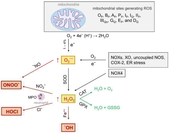 Oxidant species generating pathways and metabolism under physiological (green arrows) and oxidative stress (red arrows) conditions. The primary type of ROS produced in the body is superoxide (O2−), which is formed from single electron reduction of molecular oxygen (O2). Eleven mitochondrial sites generating ROS by leaking electrons to oxygen during substrate oxidation have been identified [40]. Beside mitochondria, NAD(P)H oxidases (NOXs), xanthine oxidase (XO), uncoupled nitric oxide synthase (NOS), cycloxygenase-2 (COX-2), and endoplasmic reticulum (ER) stress, contributing to O2− production. In turn, superoxide dismutase (SOD) converts O2− into hydrogen peroxide (H2O2). In addition, H2O2 can be directly produced by NOX4. Whatever its source, under physiological conditions, H2O2 is reduced by catalase (CAT) into oxygen and water and by glutathione peroxidase (GPX) into oxidized glutathione (GSSG) and water. However, when produced at increased levels, H2O2 generates highly reactive and cytotoxic oxidants such as hypochlorous acid (HOCl) by neutrophil myeloperoxidase (MPO) and the hydroxyl radical (OH•) in the presence of catalytically active iron (Fe++). In addition, O2− combines with nitric oxide (•NO) to form peroxynitrite (ONOO−), which can also be produced by H2O2 in the presence of nitrite (NO2−) via MPO-mediated reaction.