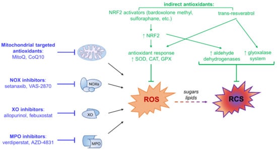 Pharmacological inhibition of specific reactive oxygen species (ROS) sources (blue) and indirect antioxidant strategies (green). Targeting specific sources of ROS may decrease oxidative stress by directly inhibiting ROS-producing enzymes, including NADPH oxidases (NOXs), mitochondria, myeloperoxidase (MPO), and xanthine oxidase (XO). Indirect antioxidants such as inducers of nuclear factor (erythroid-derived 2)-like 2 (NRF2) (i.e., bardoxolone methyl, sulforaphane, etc.) and glyoxalase system (i.e., trans-resveratrol) may help to maintain redox homeostasis by activating endogenous antioxidants and cellular detoxifying defenses against ROS and their by-products, including reactive carbonyl species (RCS). CAT, catalase; CoQ10, coenzyme Q10; GPX, glutathione peroxidase; MitoQ, mitoquinone; SOD, superoxide dismutase.