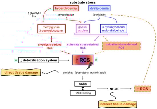 Carbonyl stress is a condition characterized by a generalized increase in the steady-state levels of reactive carbonyl compounds, namely RCS. Replacing the nature of the reactive species (i.e., ROS instead of RCS), the same definition also applies to oxidative stress. The carbonyl stress hypothesis is inextricably intertwined with the oxidative stress hypothesis, as some RCS require oxidative reactions for their formation (Figure 5).