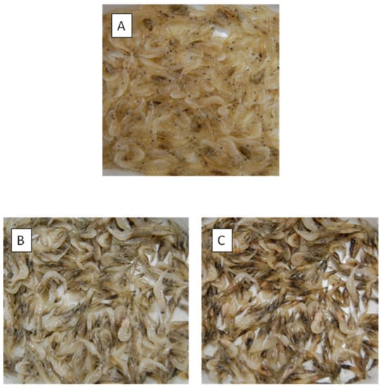 Atlantic ditch shrimp treated for 10 min with 10 µM of diselenide of bis-HT. (A) shrimp before the treatment, (B) treated shrimp after 5 days of refrigerated storage at 4–6 °C, (C) untreated shrimp after 5 days of refrigerated storage at 4–6 °C.