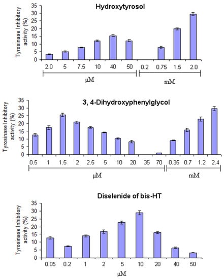 Tyrosinase-inhibitory activity (%) of hydroxytyrosol (HT), 3,4-dihydroxyphenylglycol (DHPG), and dihydroxytyrosyl diselenide (diselenide of bis-HT). Bars represent standard deviations (n = 3). The values showed significant differences (p ≤ 0.05) for all tested concentrations except for 0.05 and 1 µM of diselenide of bis-HT.