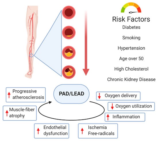 The main risk factors for the progression of peripheral artery disease (PAD)/lower extremity artery disease (LEAD) and mechanisms of pathophysiological impairment associated with PAD. Created with BioRender.